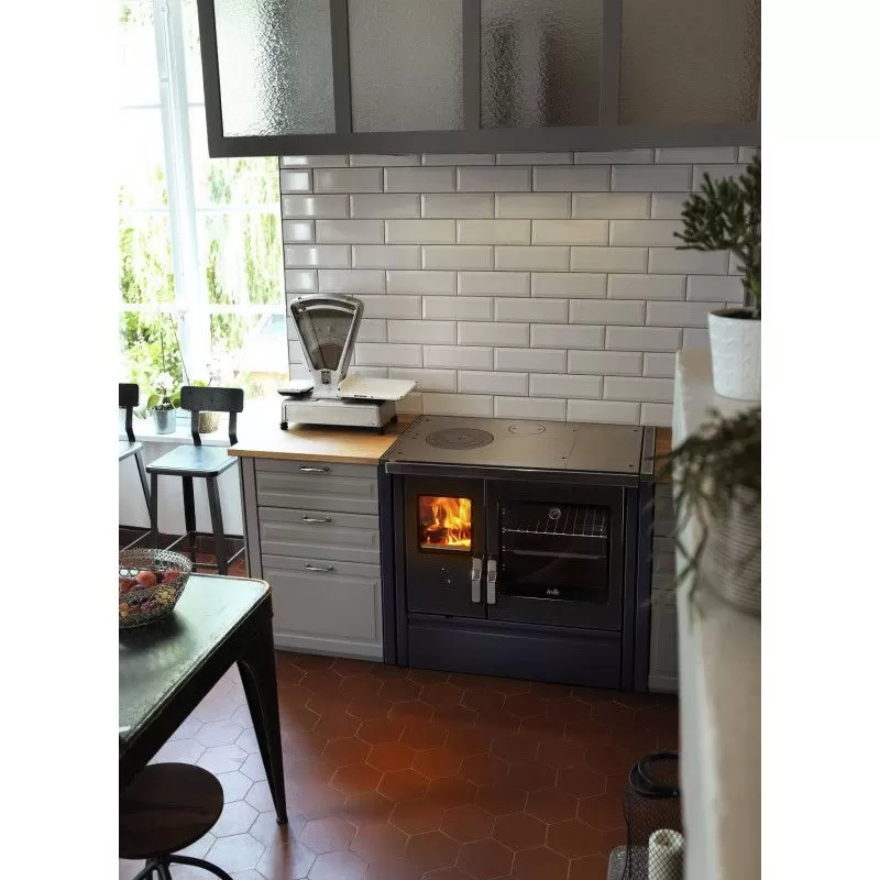 La cuisinière à bois MELISSE 90 HYDRO est au cœur de votre habitation. Le four ronronne, les petits plats mijotent et la chaleur du foyer se diffuse dans toute la maison via le réseau du chauffage central. 14 kW, habillage émaillé, plaque de cuisson et portes en fonte, foyer et four vitrés .