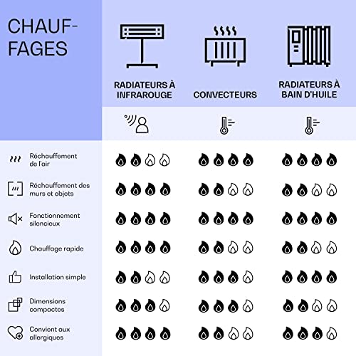- FAITES ENTRER LE SOLEIL DANS LA MAISON : Les radiateurs infrarouges utilisent 98% de la chaleur produite, bien plus qu’un radiateur électrique classique. Vous avez une chaleur efficace sur le plan énergétique avec une perte de transfert quasi nulle.