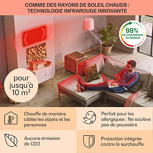 - RÉCHAUFFEZ- VOUS VITE : Les chauffages infrarouges sont réputés pour utiliser 98 % de la chaleur produite, bien plus qu’un chauffage électrique classique. Efficace sur le plan énergétique pour que votre maison soit aussi chaude qu’en été.