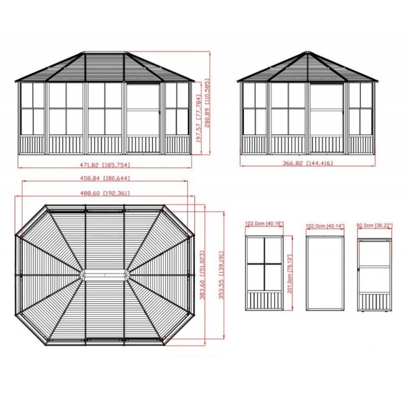 Le pavillon Charleston à 14 pans de Sojag s’inscrit dans un rectangle de 384x489cm de côtés. Il possède une structure robuste en aluminium gris thermolaqué qui ne craint pas la corrosion et qui peut soutenir une charge de neige exceptionnelle de 150kg/m². La hauteur faîtière de la structure est de 280cm, la largeur au sol est de 367x472cm. Le pavillon est composé de 14 panneaux, dont 12 fenêtres à guillotine et 2 portes coulissantes de 92cm de passage pour une hauteur de 201cm.