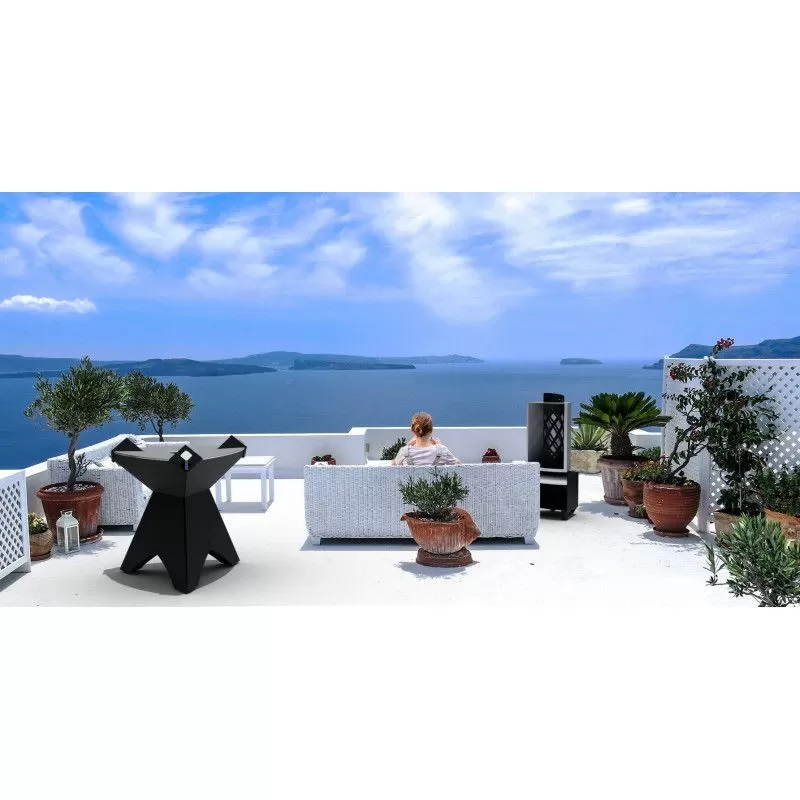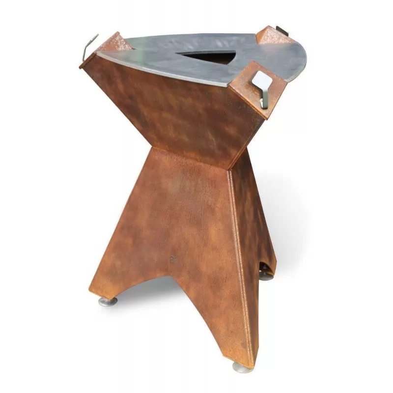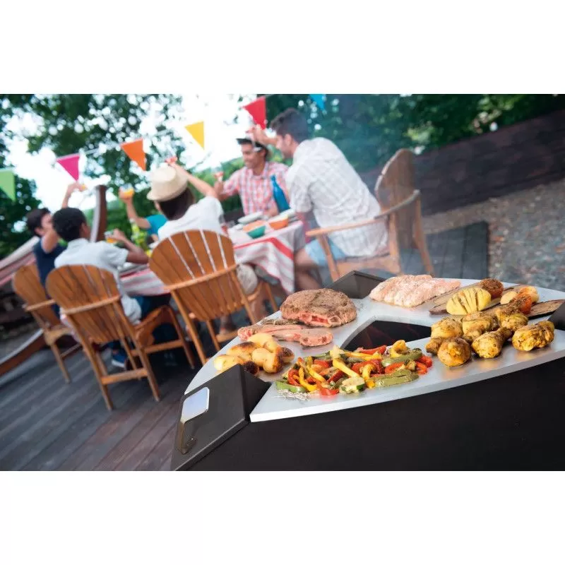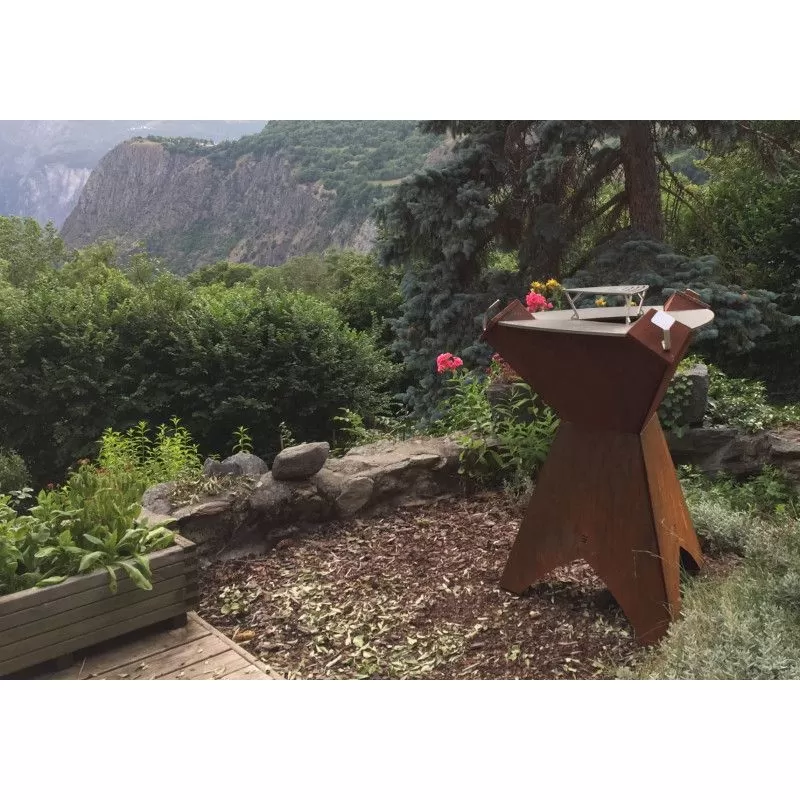 Avec son design et son système breveté, la plancha ORIGINE est unique. Elle offre une facilité d’utilisation inégalée pour une plancha au bois et permet des cuissons homogènes avec son foyer innovant. Deux tailles (diam 80cm ou 100cm) et deux finitions (acier peint ou corten) disponibles.