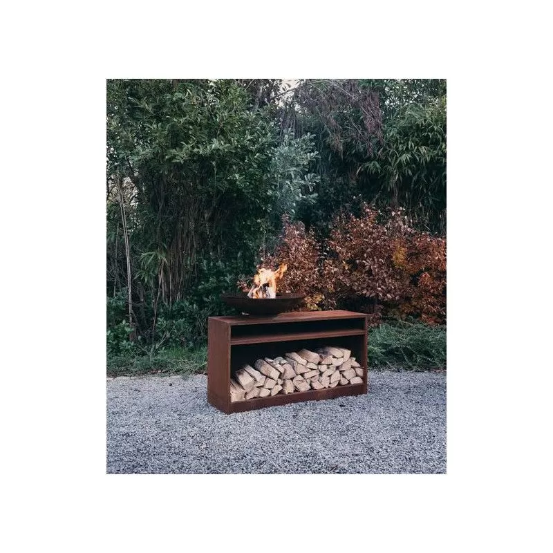 Il est grand, il est très tendance, il offre un grand espace pour ranger des bûches, ce meuble de jardin est pensé pour accueillir les planchas Outr. Mais, il pourra aussi parfaitement convenir à tout ceux qui cherchent un plan de travail pour cuisiner au jardin.